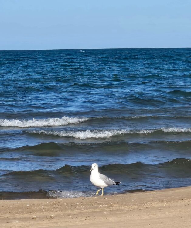 The picture was taken at a local beach on Lake Michigan. I caught this solitary gull strutting along the seashore.